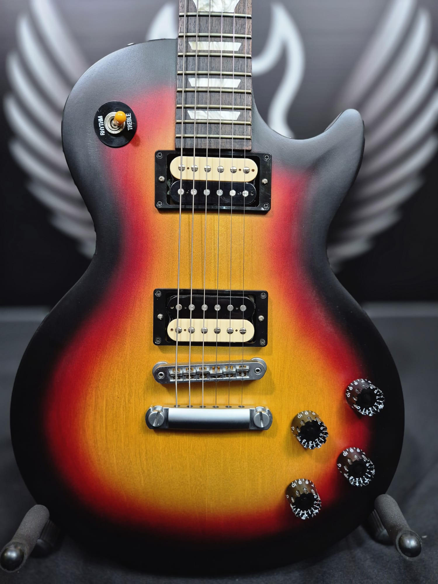 (officially the Gibson LPJ) is an American-made, stripped-down electric guitar introduced as a high-quality, budget-friendly option in Gibson’s 2013 and 2014 model years. It features a mahogany body with a carved maple top, a maple neck with a rounded ’50s profile, and a minimalist satin nitrocellulose finish.