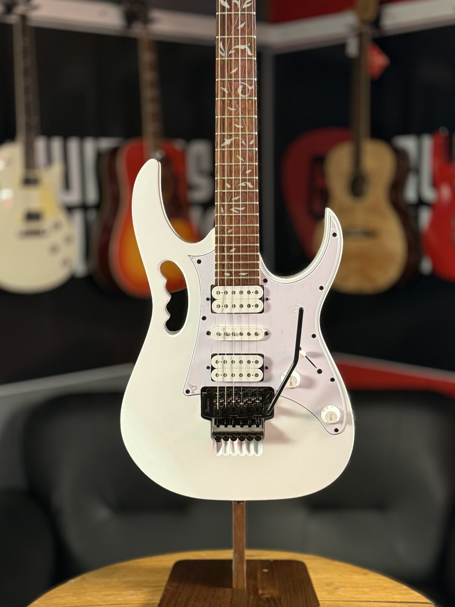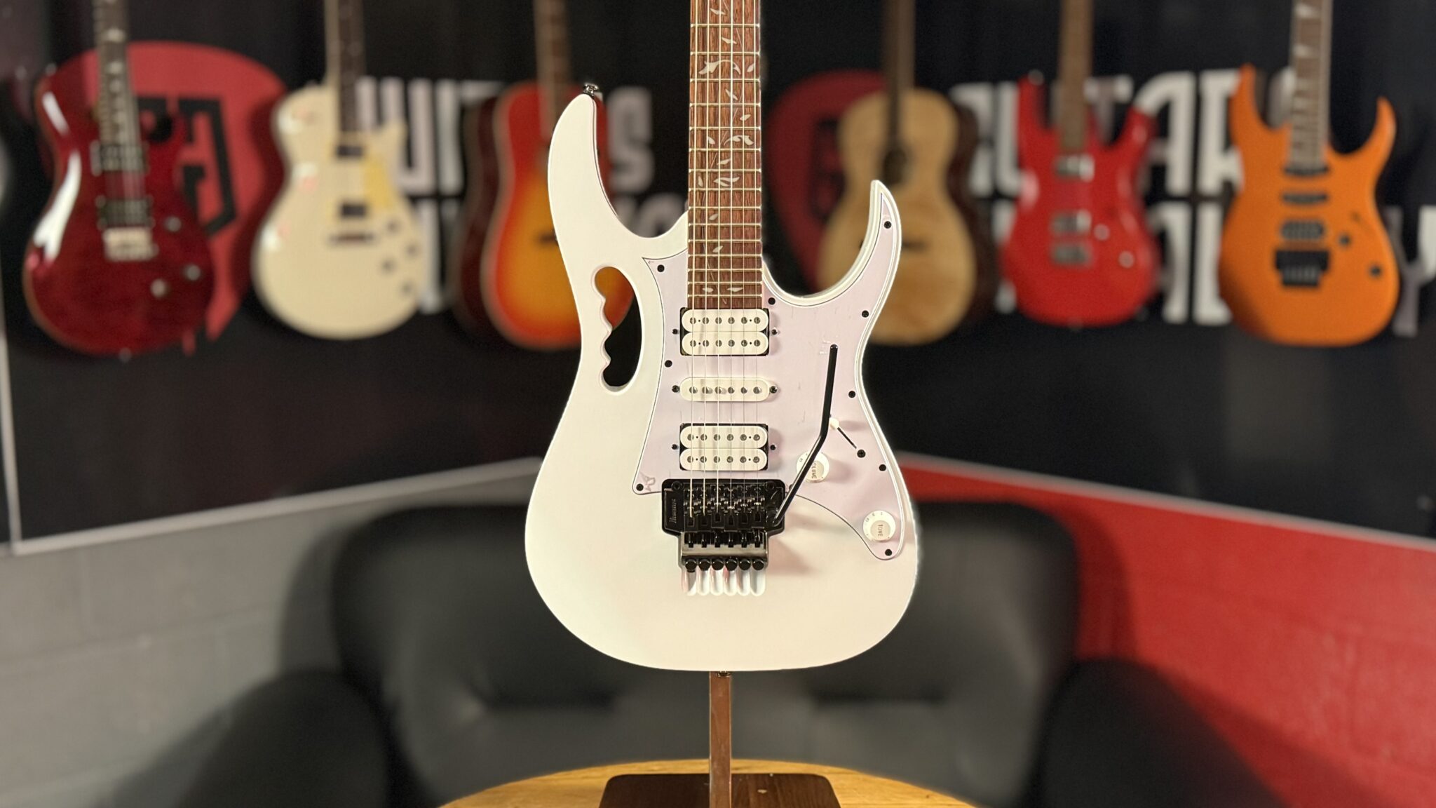 The JEMJR features Ibanez’s standard double-locking tremolo bridge, which provides exceptional tuning stability even when subjected to extreme pitch bending. The bridge locks the strings at both the nut and bridge, allowing radical dive bombs and squeals without the tuning issues associated with traditional tremolo systems. The double-locking tremolo is a must-have for any guitar meant to withstand the rigors of shred guitar performance.