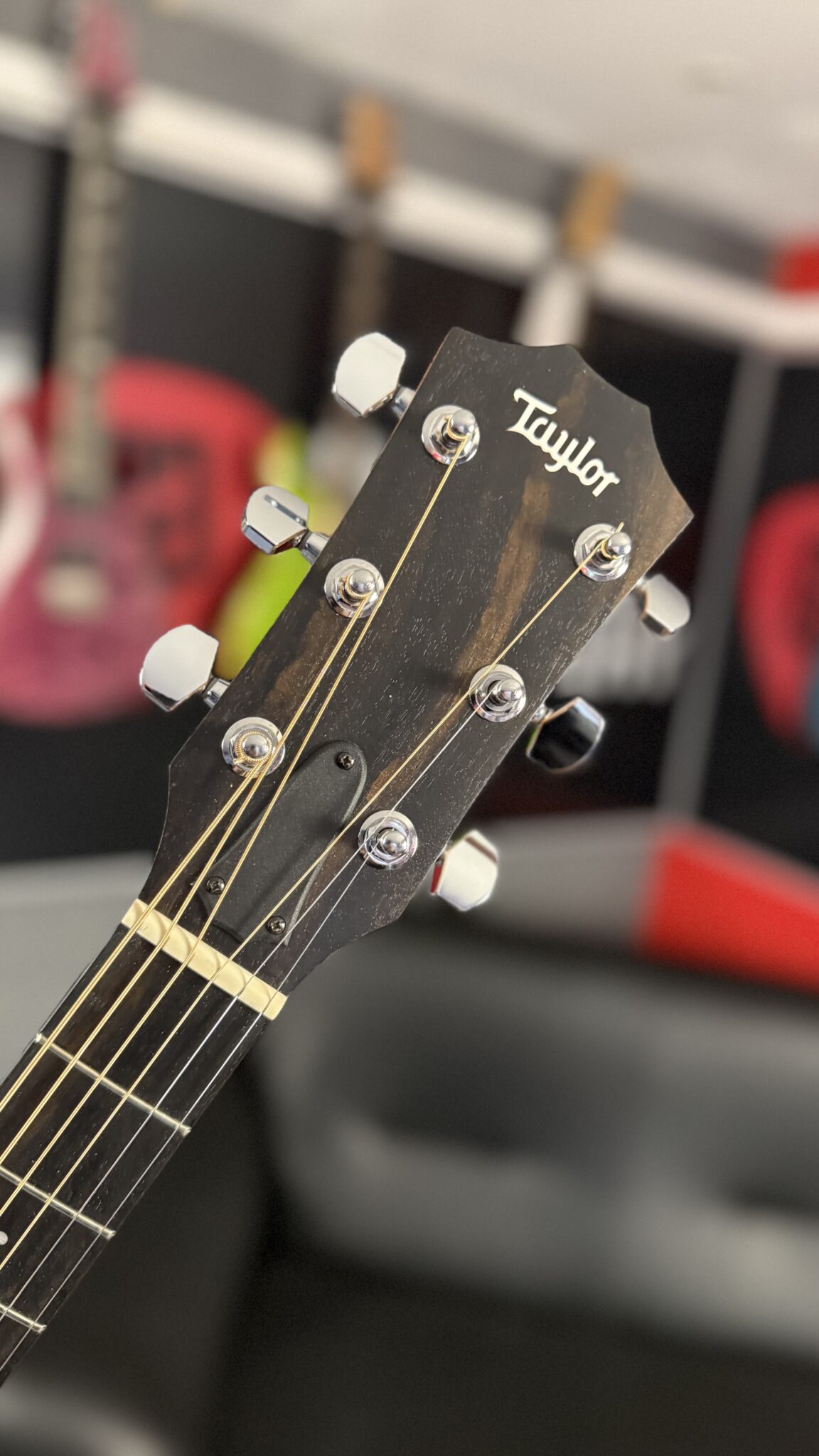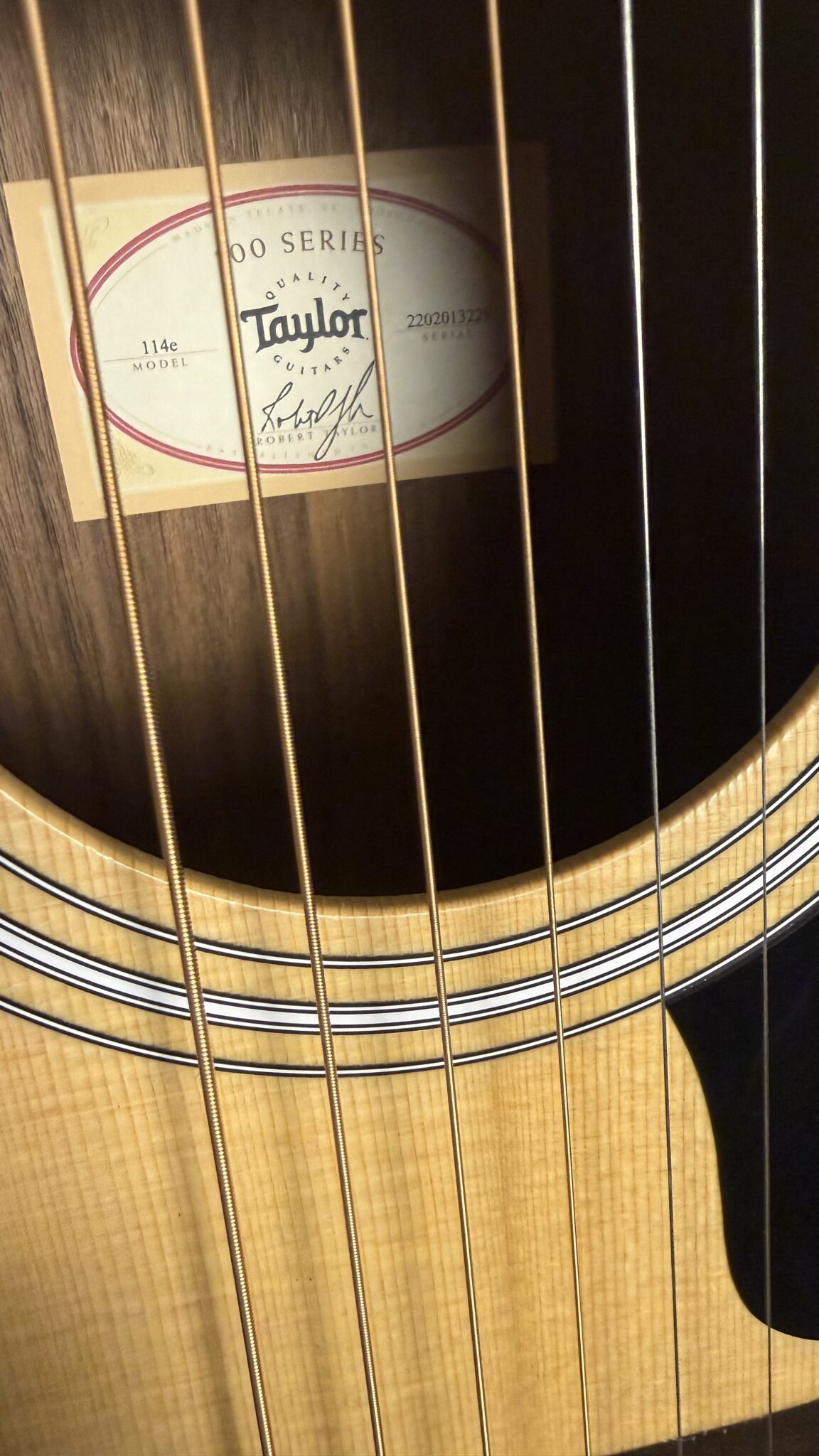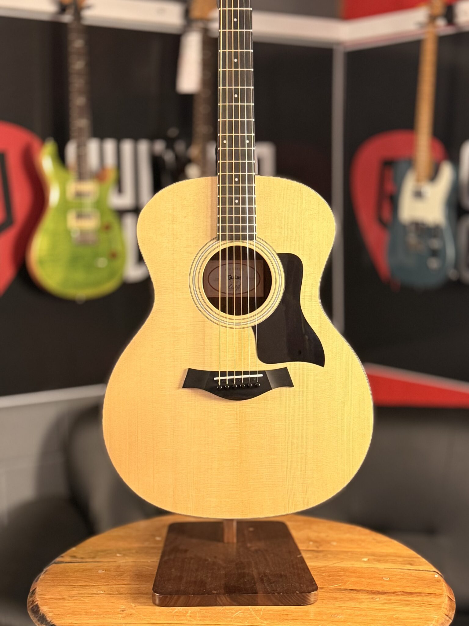 the Taylor 114 is a Grand Auditorium sized acoustic made with a Spruce top and layered Walnut for the body. Unlike the electro acoustic model 114ce, the Taylor 114 is a pure acoustic so there is no pickup and no cutaway in the body. This is great for players who want excellent tones and a symmetrical look. The 100 series from Taylor represents great value for money.